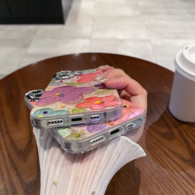 3D Floral Embossed iPhone Cases With Rhinestone Camera Ring